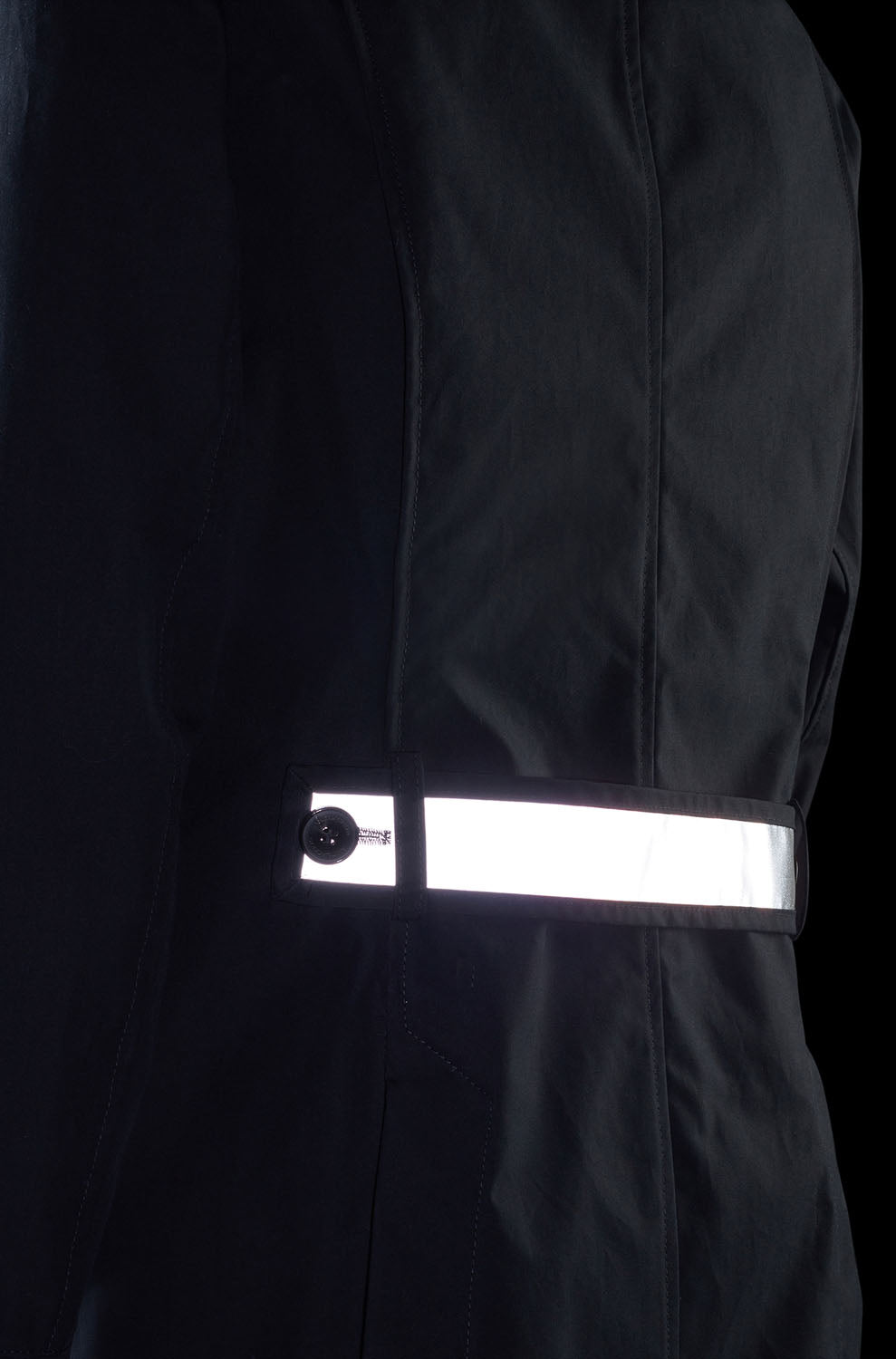 The shoulder bulge, the epaulettes and, of course, the water-repellent materials from which we tailor it: Etaproof* for year-round use. If you look at Franz from the back, you will notice important differences and typical features of our style: movement pleats at the back and two side slits for maximum arm freedom in the bike saddle, an adjustable back strap with 3M™ Scotchlite™ reflective stripes. The turn-up cuff at the end of the sleeves is also lined with reflective material from the inside. This is deliberately only noticeable when the cuff is folded down - quite simply Urban Utility.