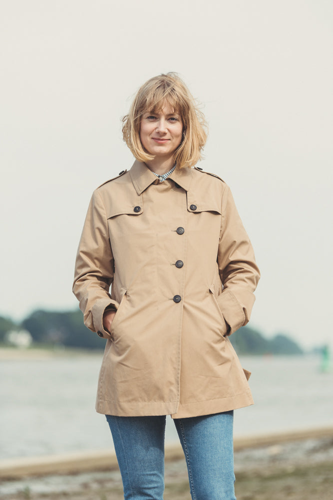The classic trench was the inspiration for our city-suitable short coat Franziska. This is evident in the asymmetrical, protective front, which is reminiscent of the classic double-breasted coat.