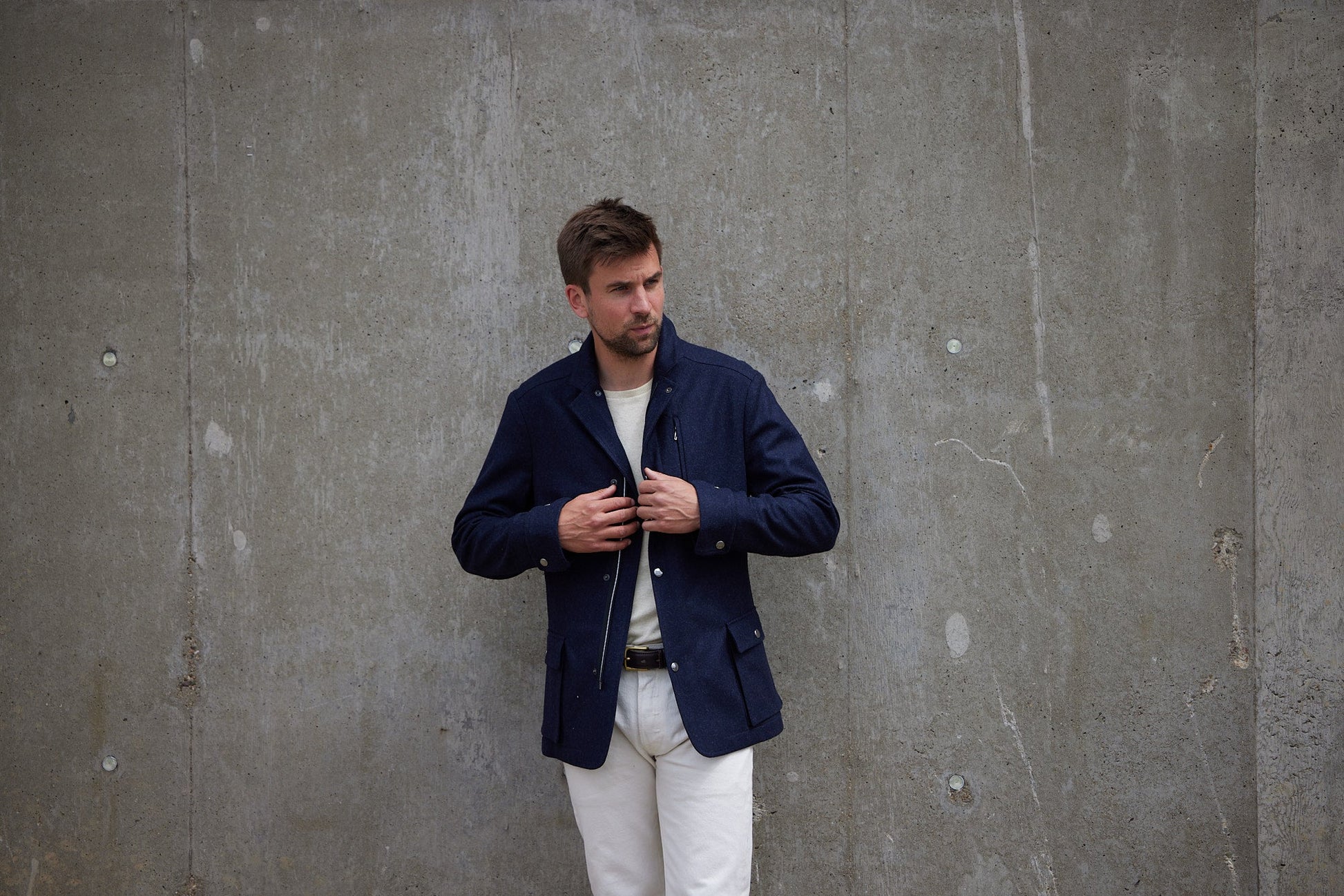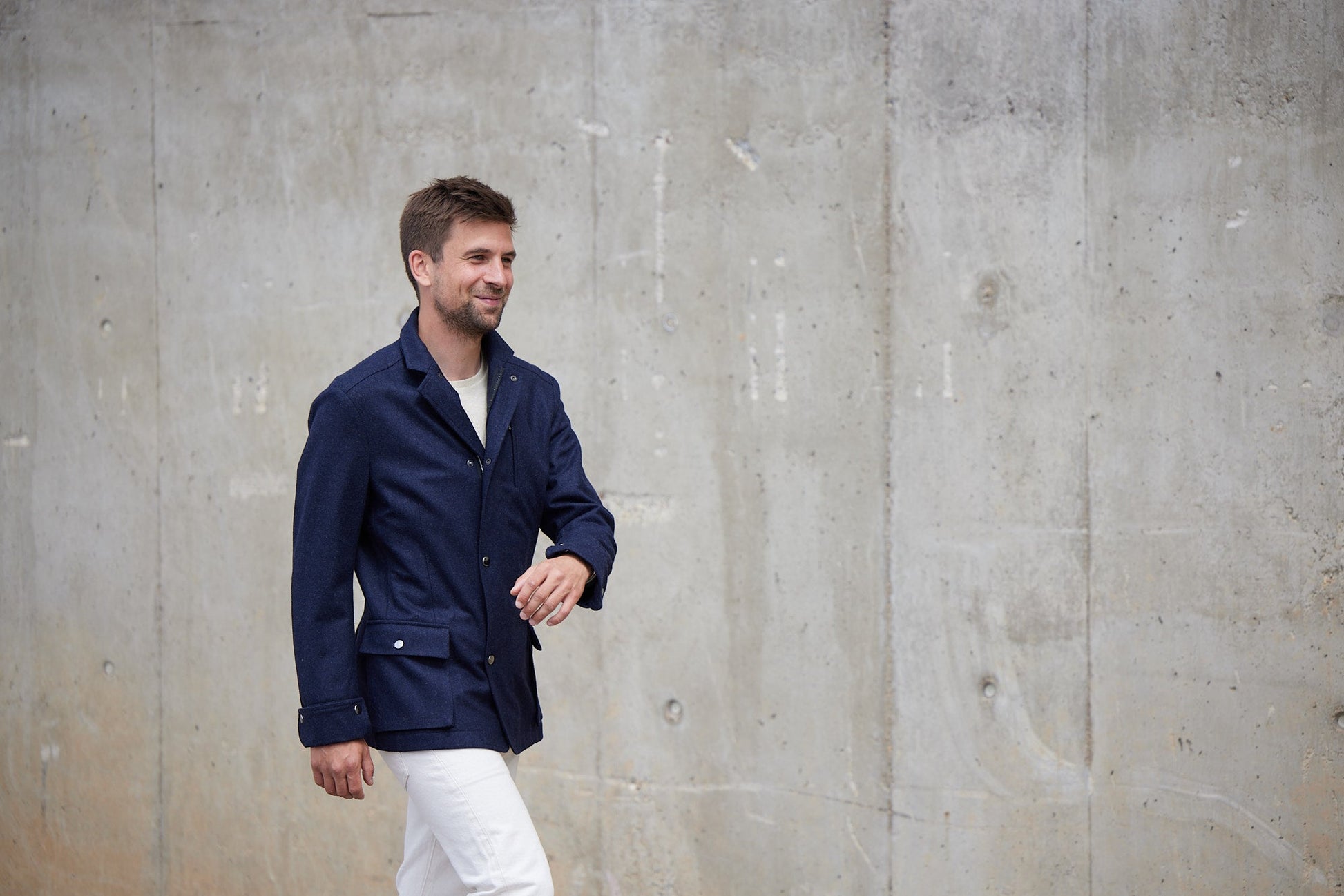 Thanks to Bavaria Loden, it is water-repellent and keeps you warm, fits close to the body, is not constricting thanks to the movement pleat at the back, and can be closed windproof at the neck with a zip and the generously dimensioned storm flap. The vertical zipped pocket on the left chest is easy to reach for right-handers, and stows everything that needs to be within easy reach. Two additional outer pockets and four inner pockets easily replace a small backpack. The jacket is only lined in the sleeve because the inside of the fabric feels extremely cosy; it would simply be a shame to hide it under a lining. So that Leon is not only noticed for its good design, we have again given it some reflectors, which is useful in the dark, and not only for cyclists.