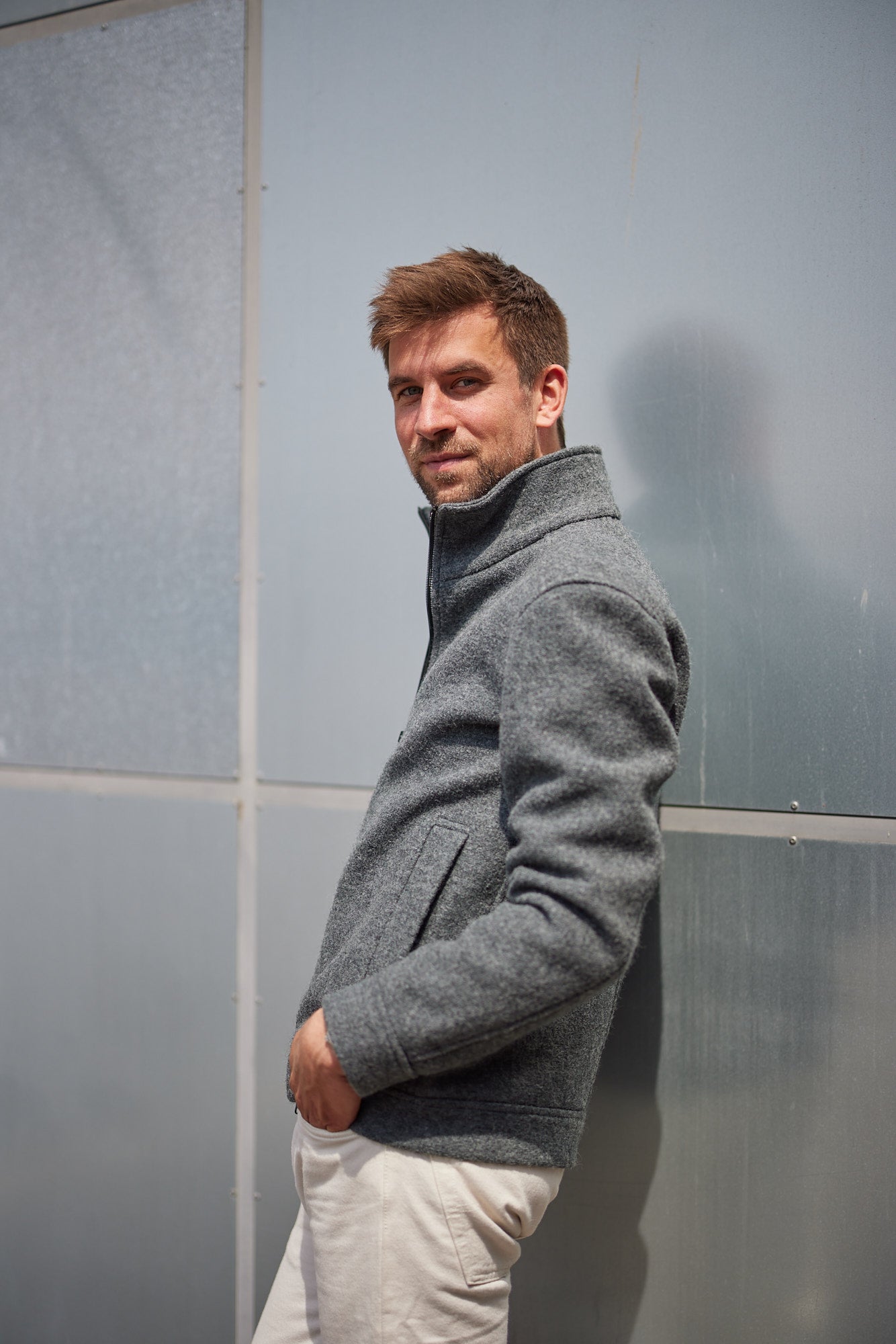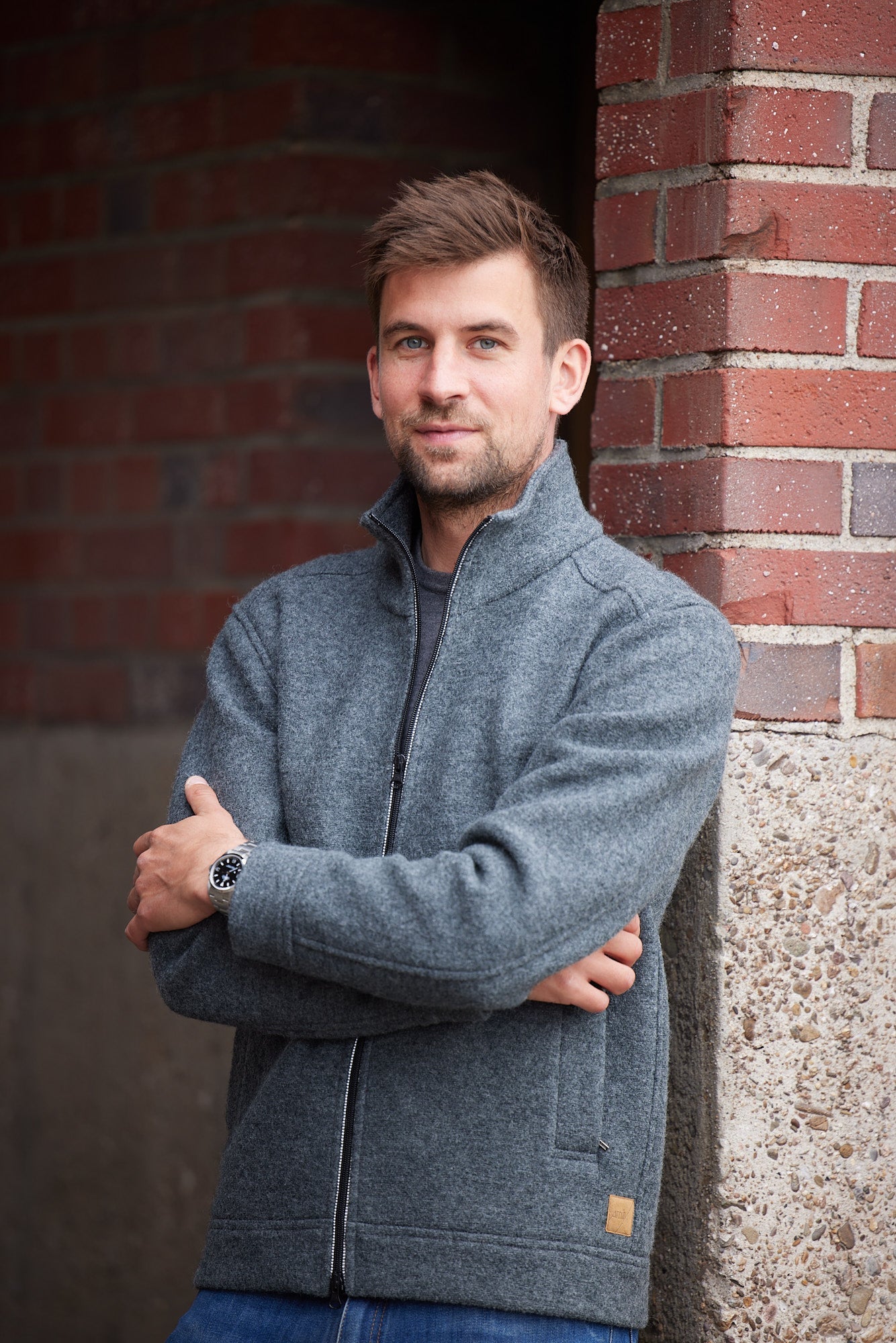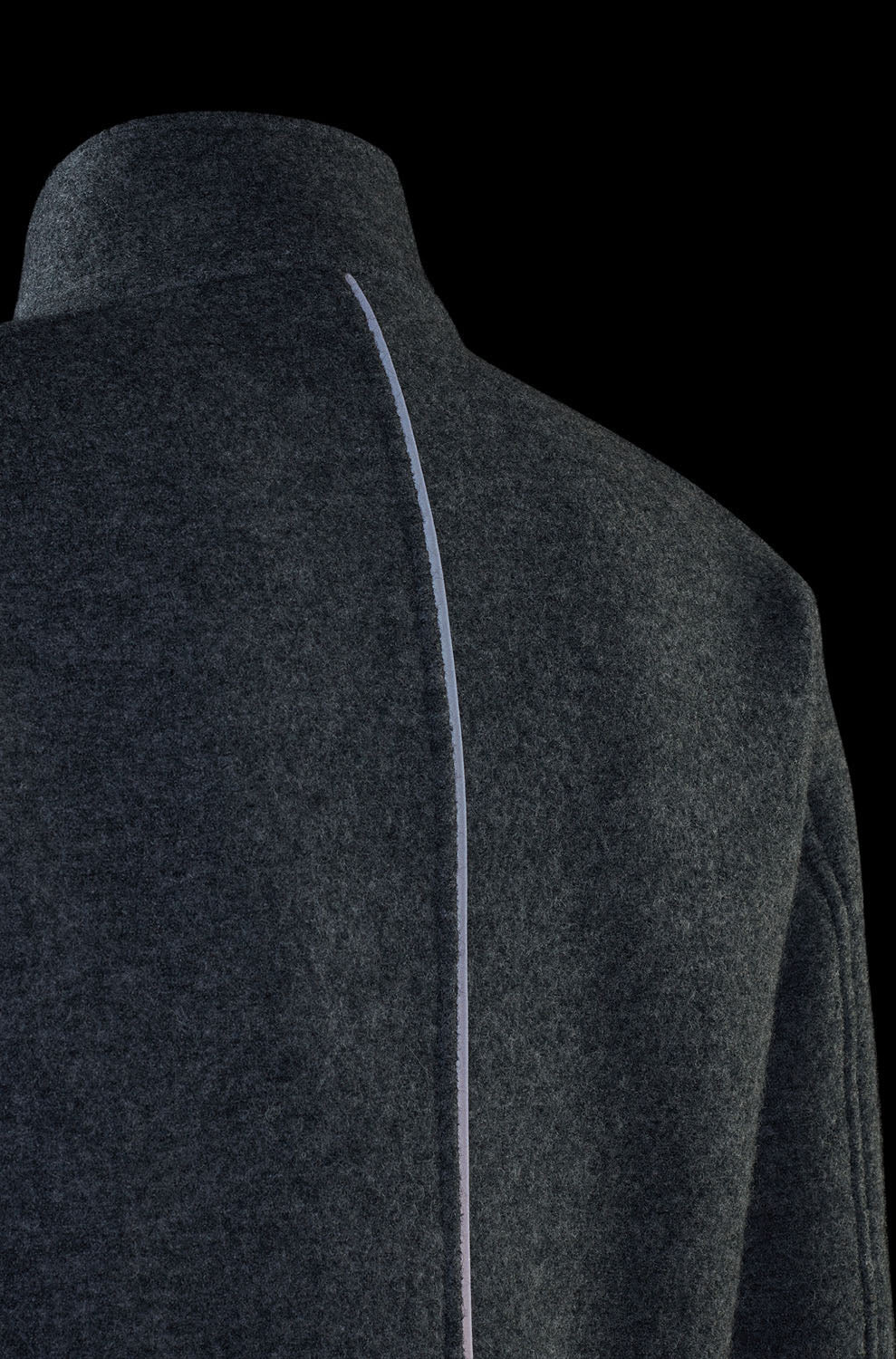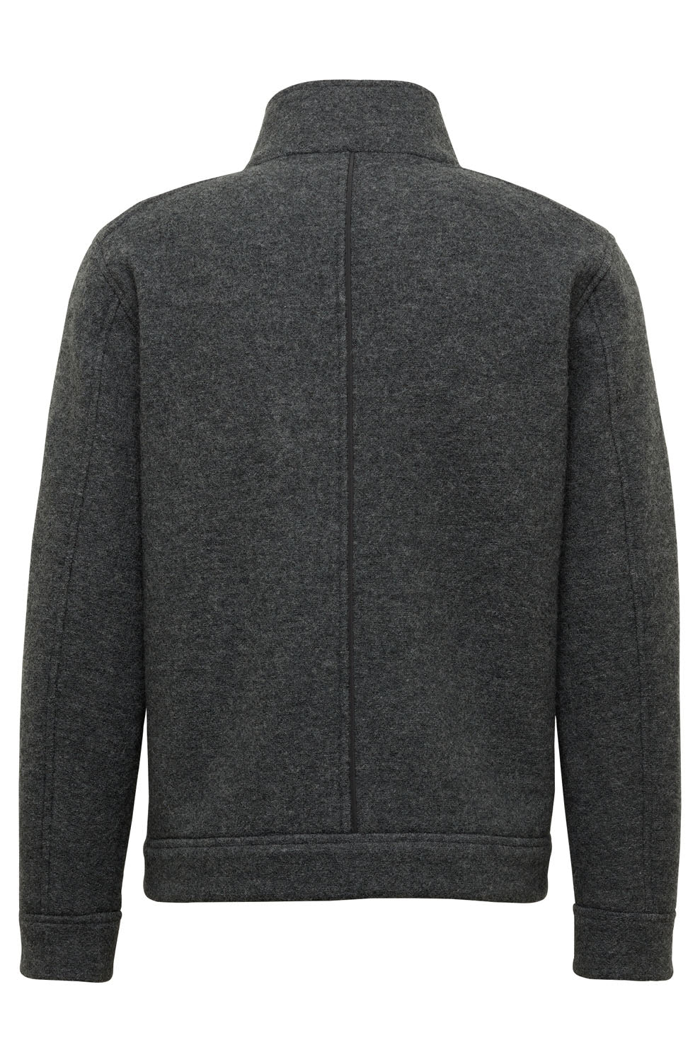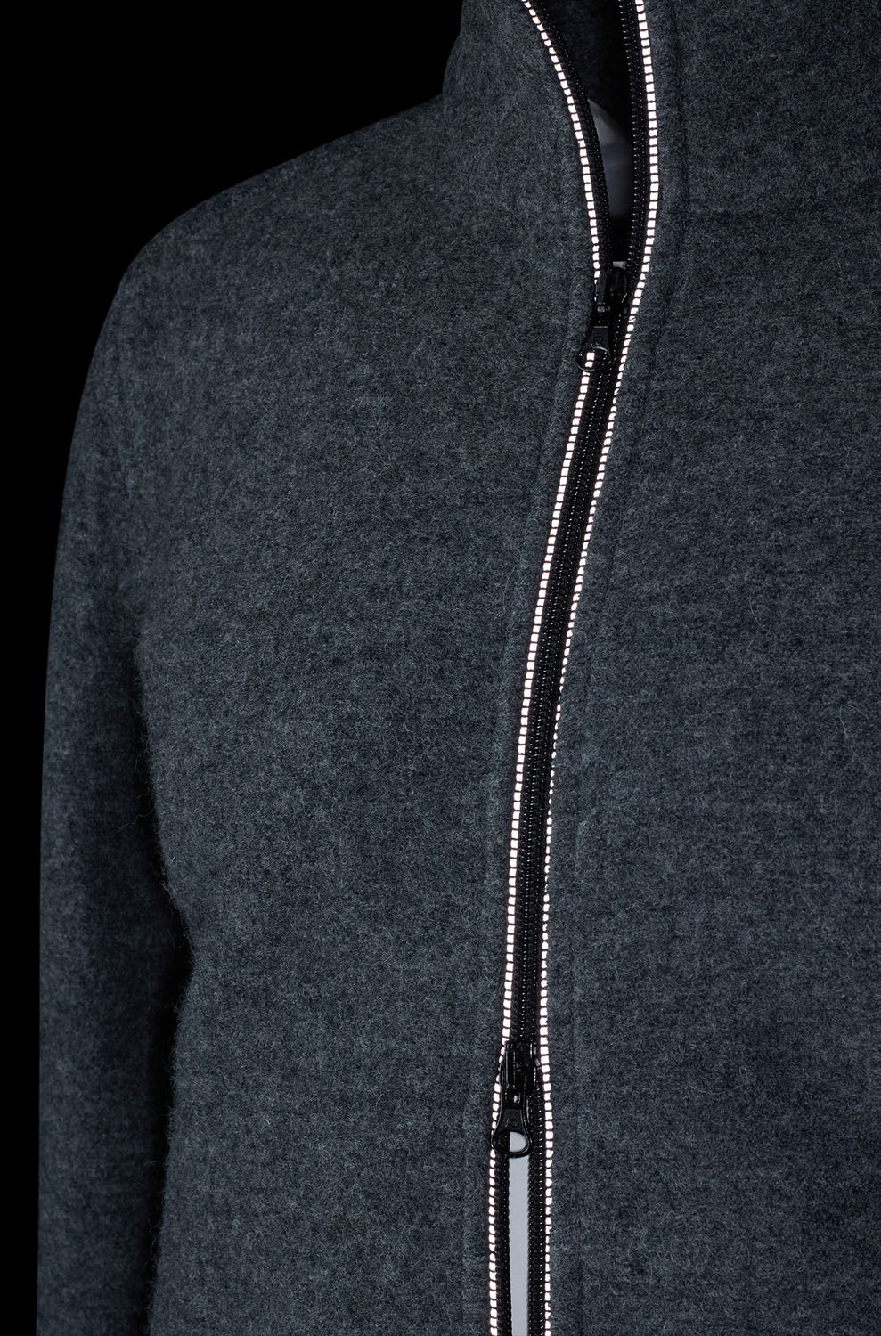 Warming through the use of 430 grams/square metre knitted whale from pure new wool from the Moessmer cloth factory, protective in the dark through the reflective 2-way zip and the reflective back piping.