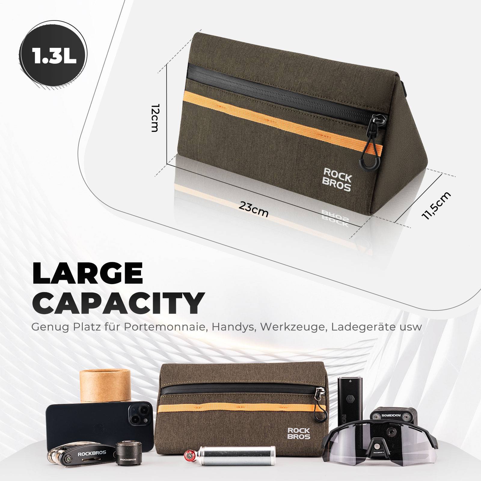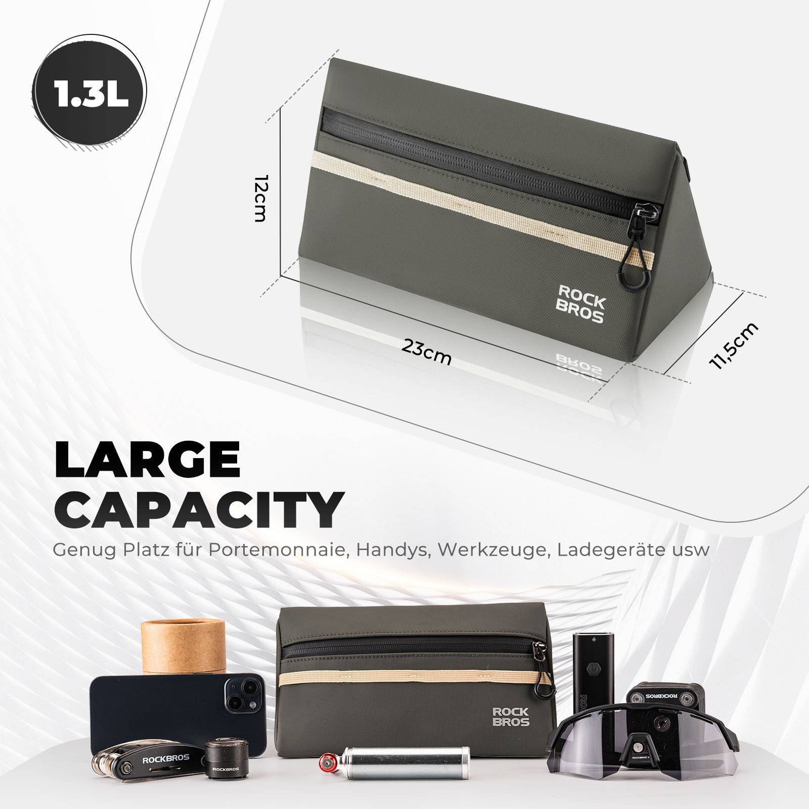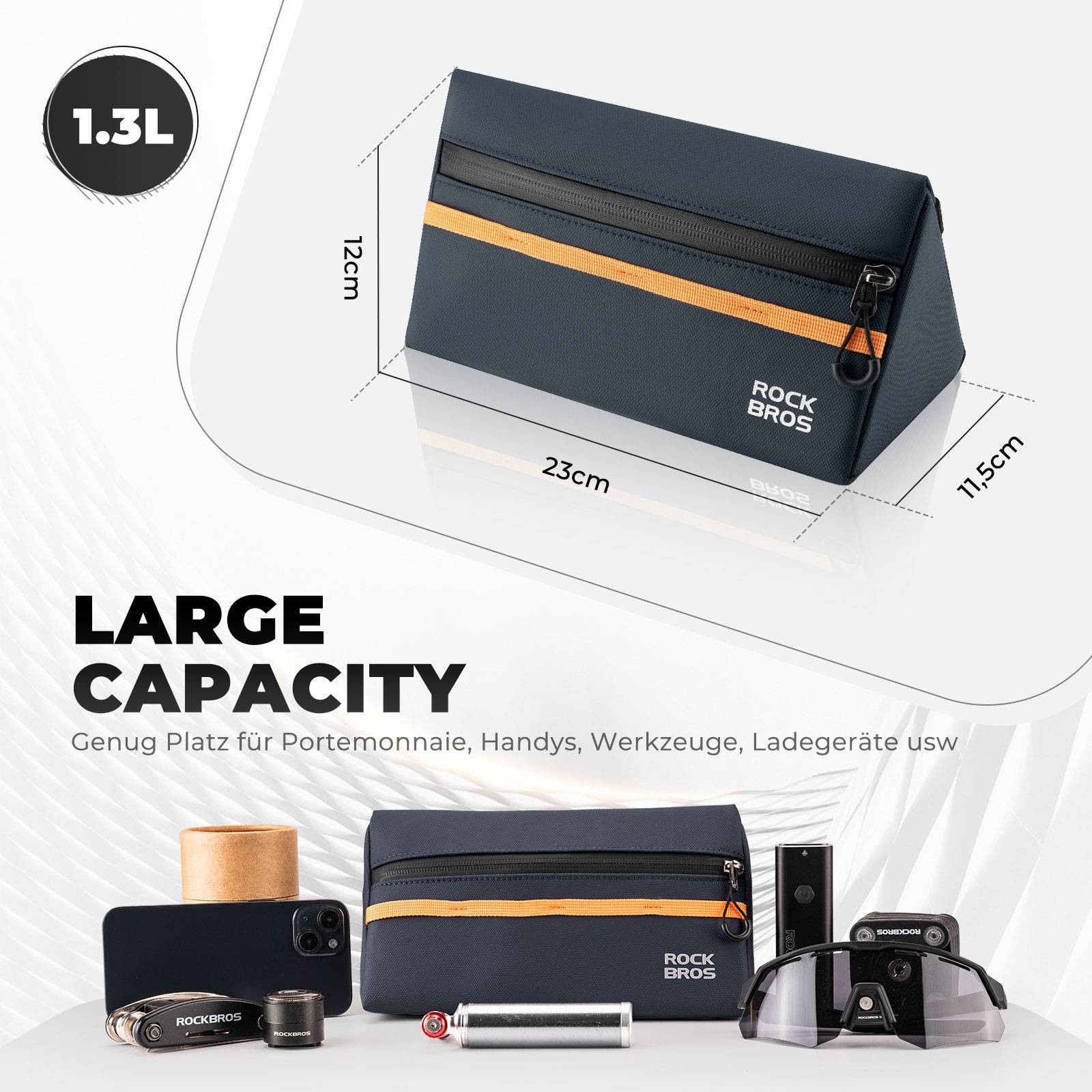 Approx. 23cm x 12cm x 11.5cm, 1.3L capacity. The bicycle handlebar bag can easily store items such as mobile phones, power banks, repair tools, wallets, energy bars, etc. The bicycle handlebar bag can meet your daily needs.